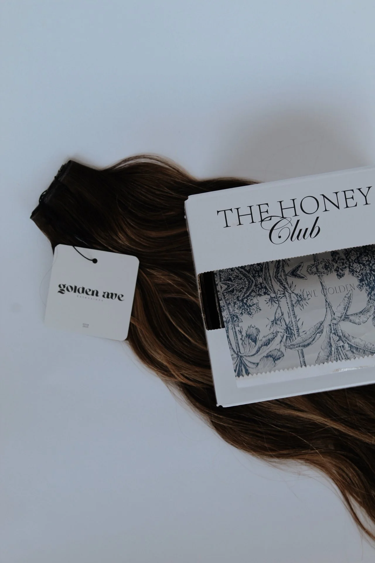 A young woman with long blonde wavy hair holds two bundles of similar hair extensions with tags that read 'golden ave', standing against a plain white background.